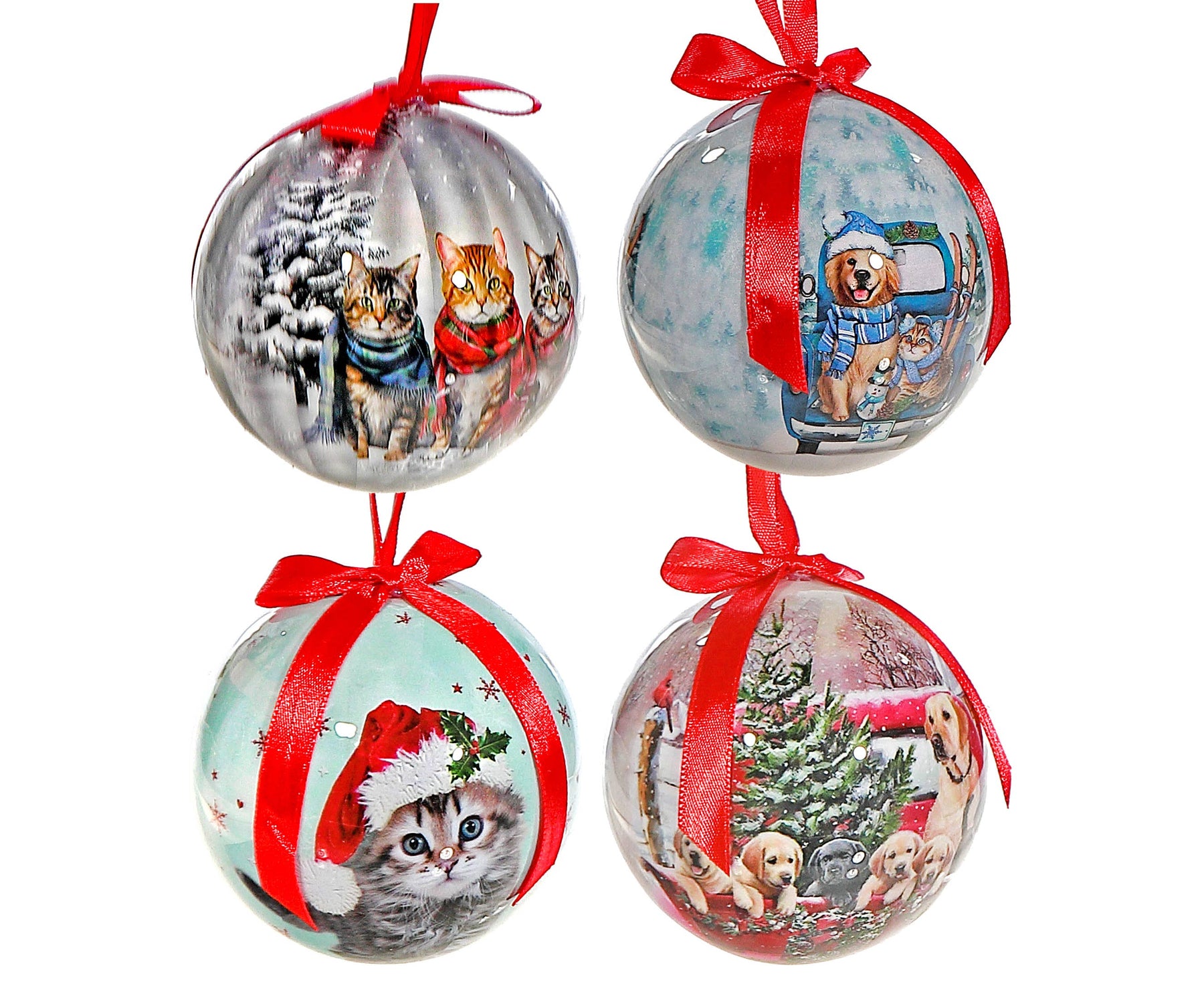 This playful and adorable ornament features a ribbon with images of cats and dogs, adding a fun touch to any Christmas tree or fireplace.
