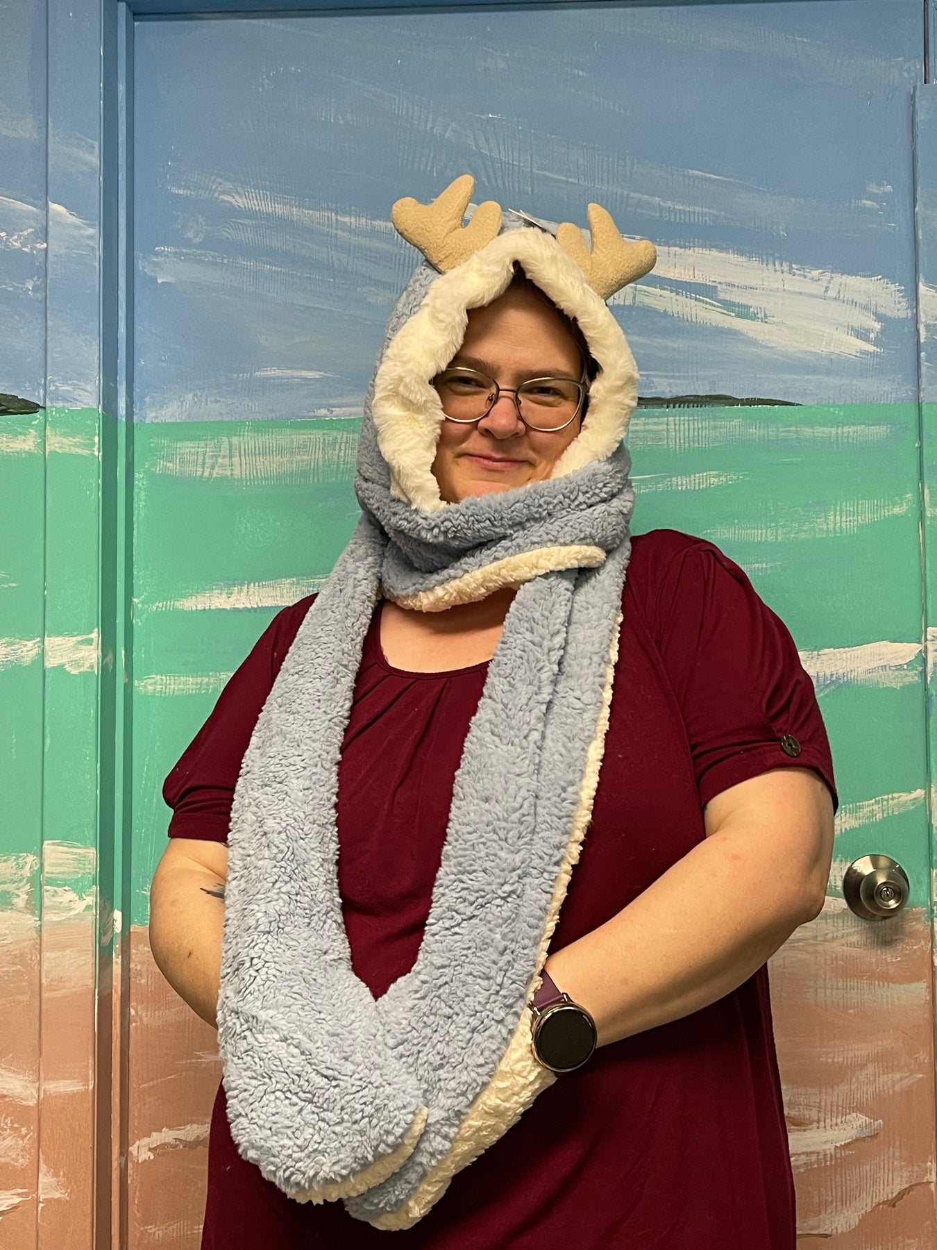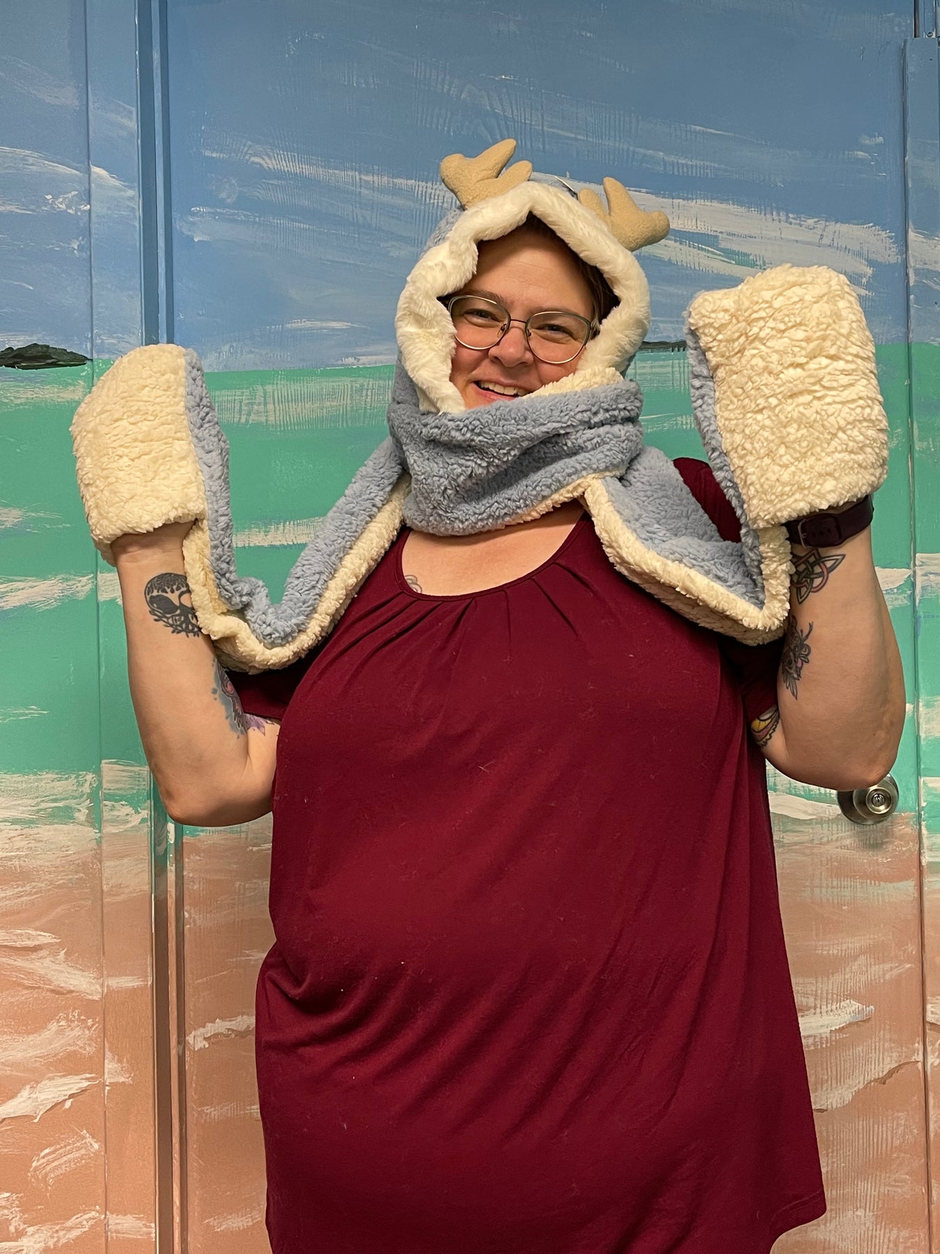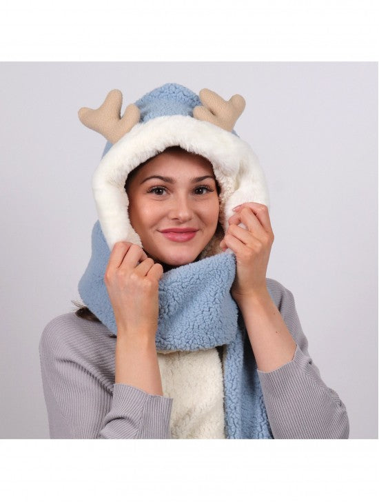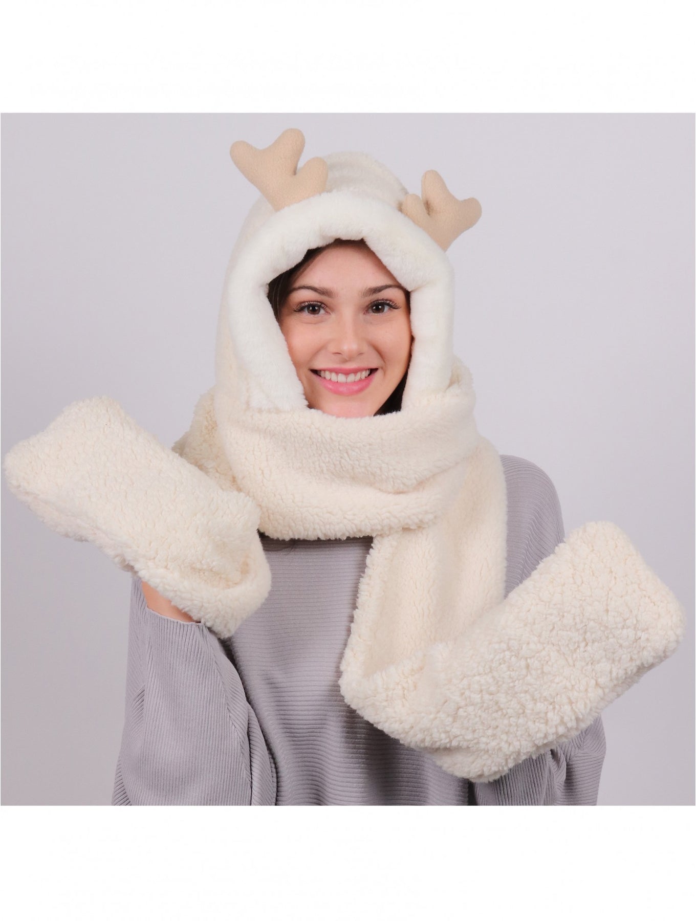 Plush Multi-functional Matching Set ( Scarf, Reindeer Hat & Mitts). Popular items for winter and the holidays. Great for gift giving!