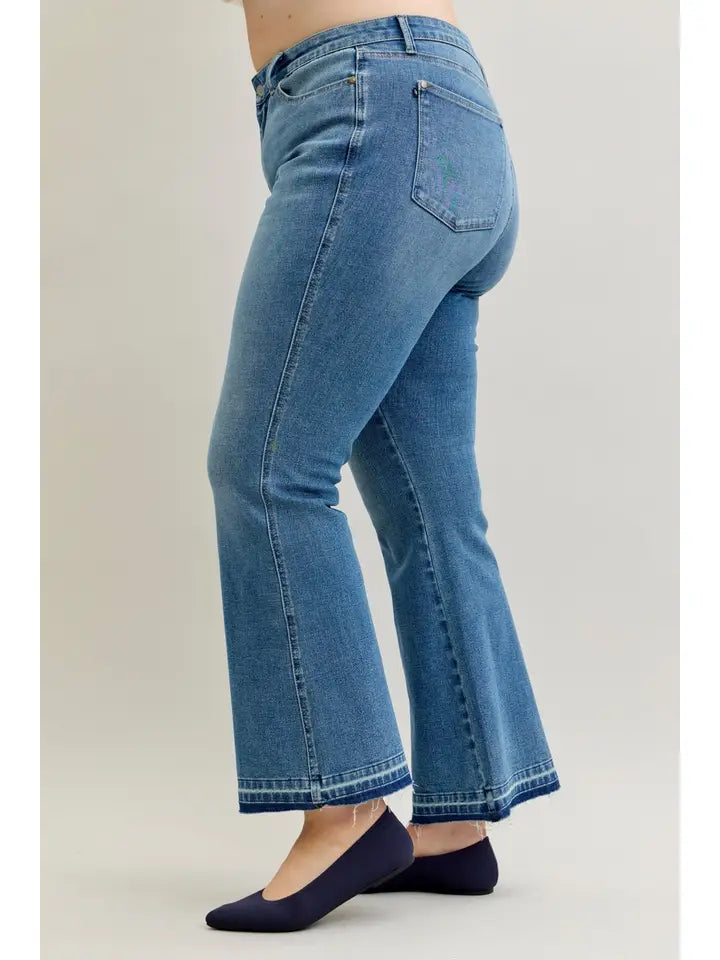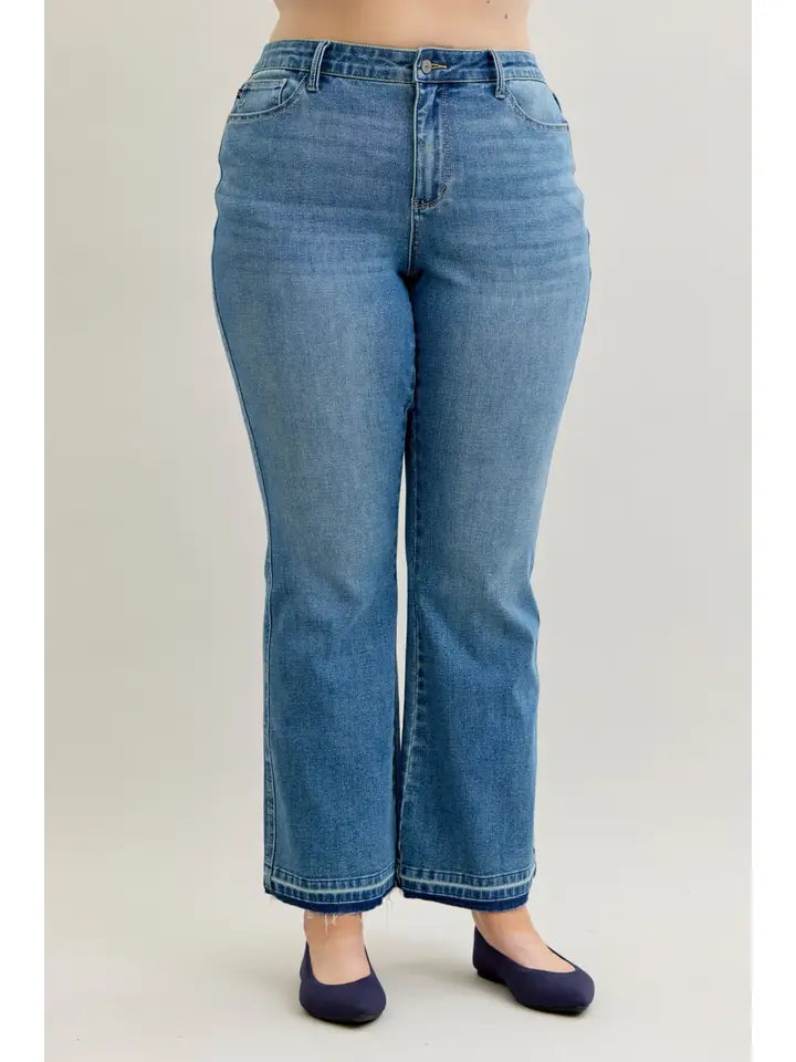 Introducing the MR Slim Bootcut Release Hem from Judy Blue Jeans. These plus-size jeans are designed for the everyday woman, featuring a regular fit and medium wash for a casual look.