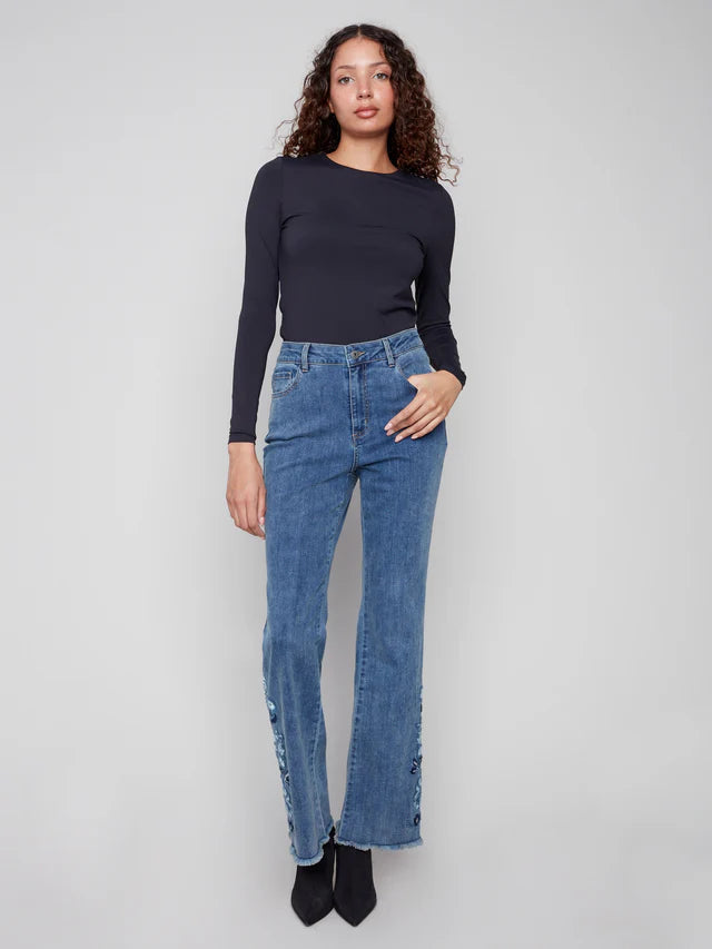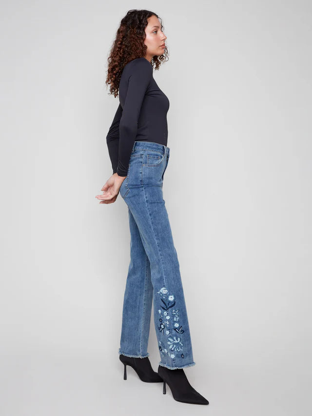 Floral embroidery along the sides adds a charming detail, while the stretchy fabric ensures a perfect fit. The gentle flare at the hem creates an elegant look, making these jeans perfect for both casual and dressy occasions.
