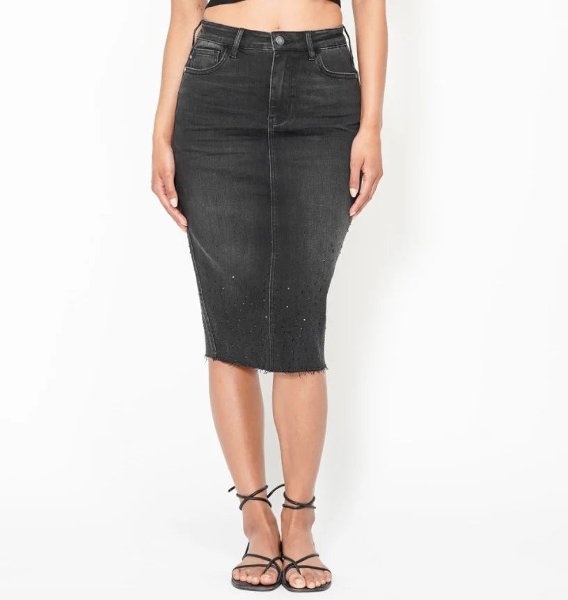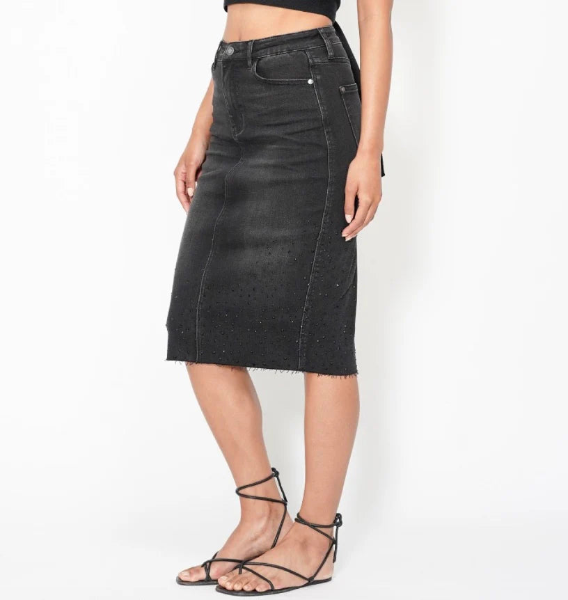 With a high waist and mid length, this skirt will flatter your figure and add a touch of glam to any outfit. The rhinestone embellishments add a playful sparkle, making it perfect for a night out.