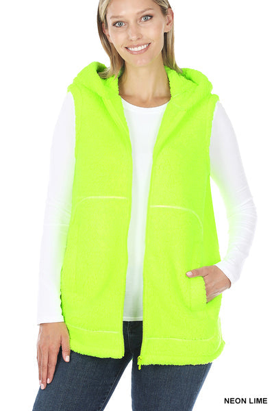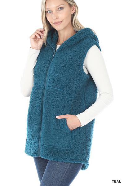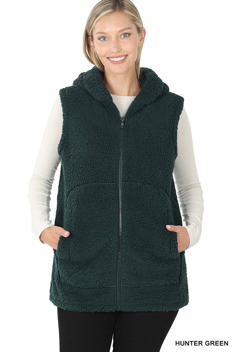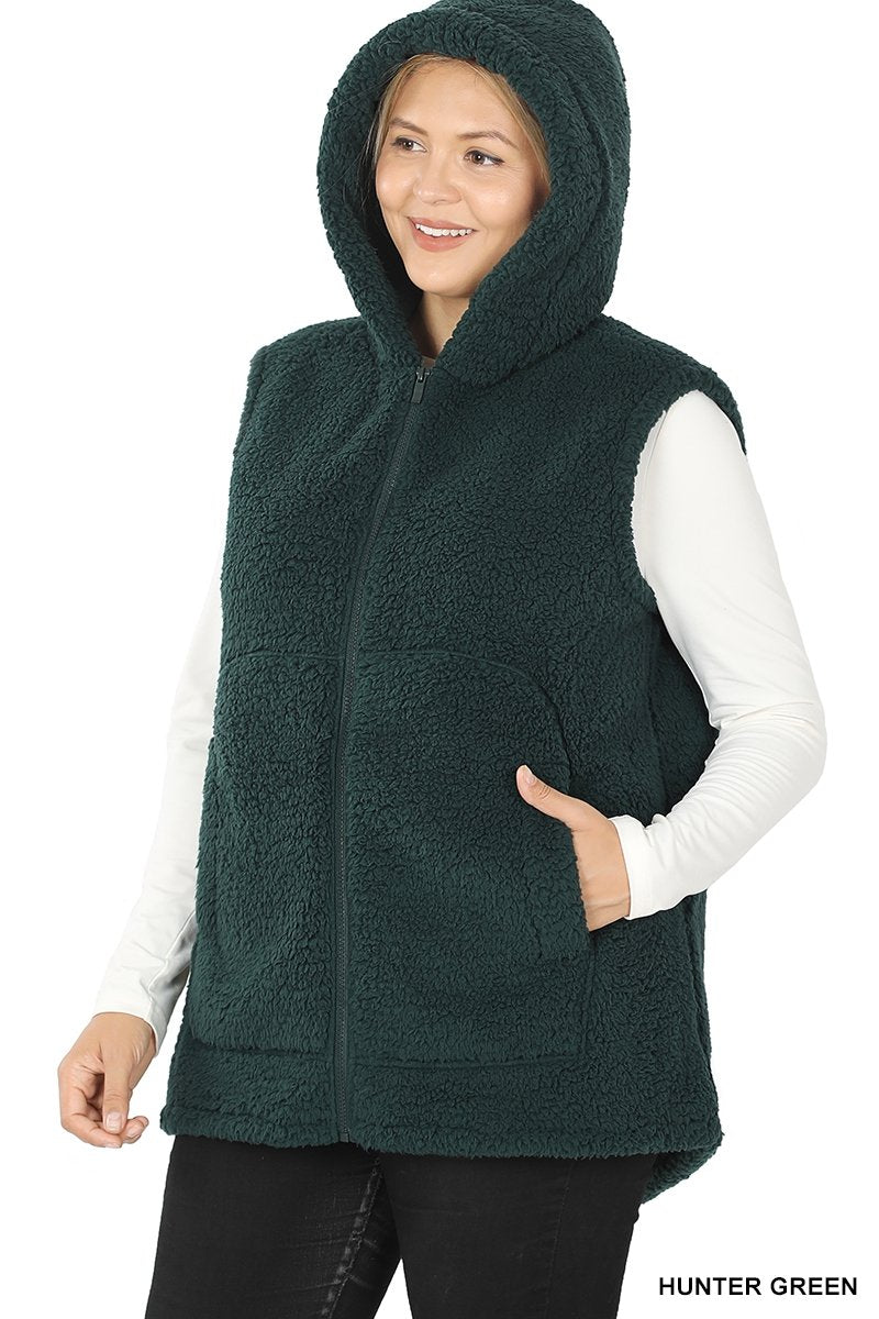 PLUS SOFT SHERPA HIGH-LOW HEM HOODED VEST WITH POCKETS - BOTH SIDES SHERPA