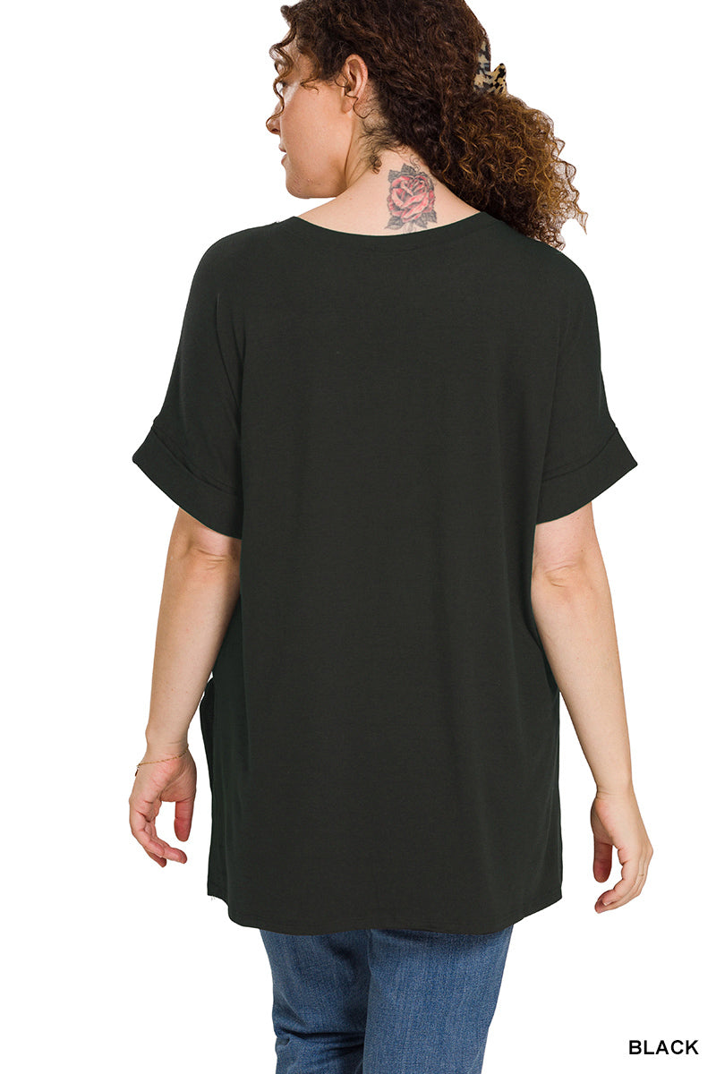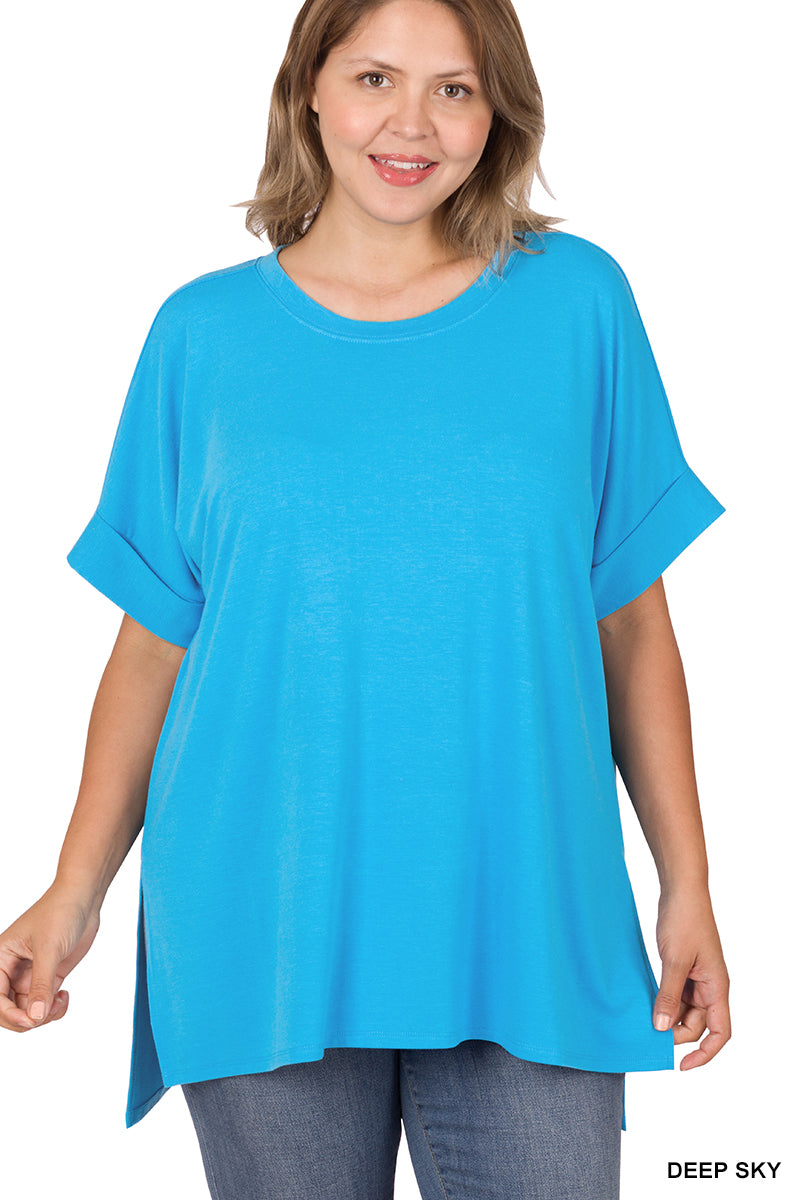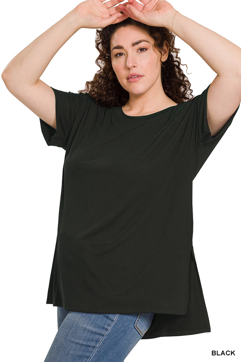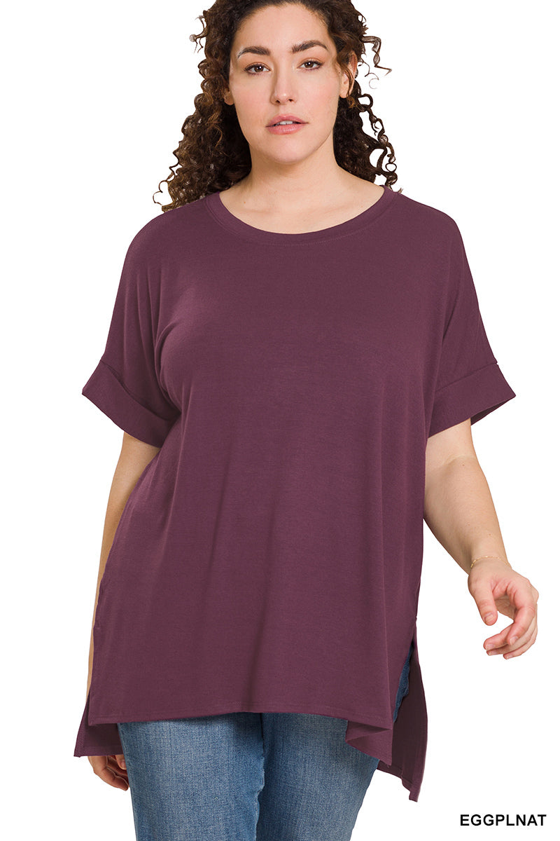 ROLLED SHORT SLEEVE ROUND NECK TOP WITH SIDE SLIT HIGH-LOW HEM