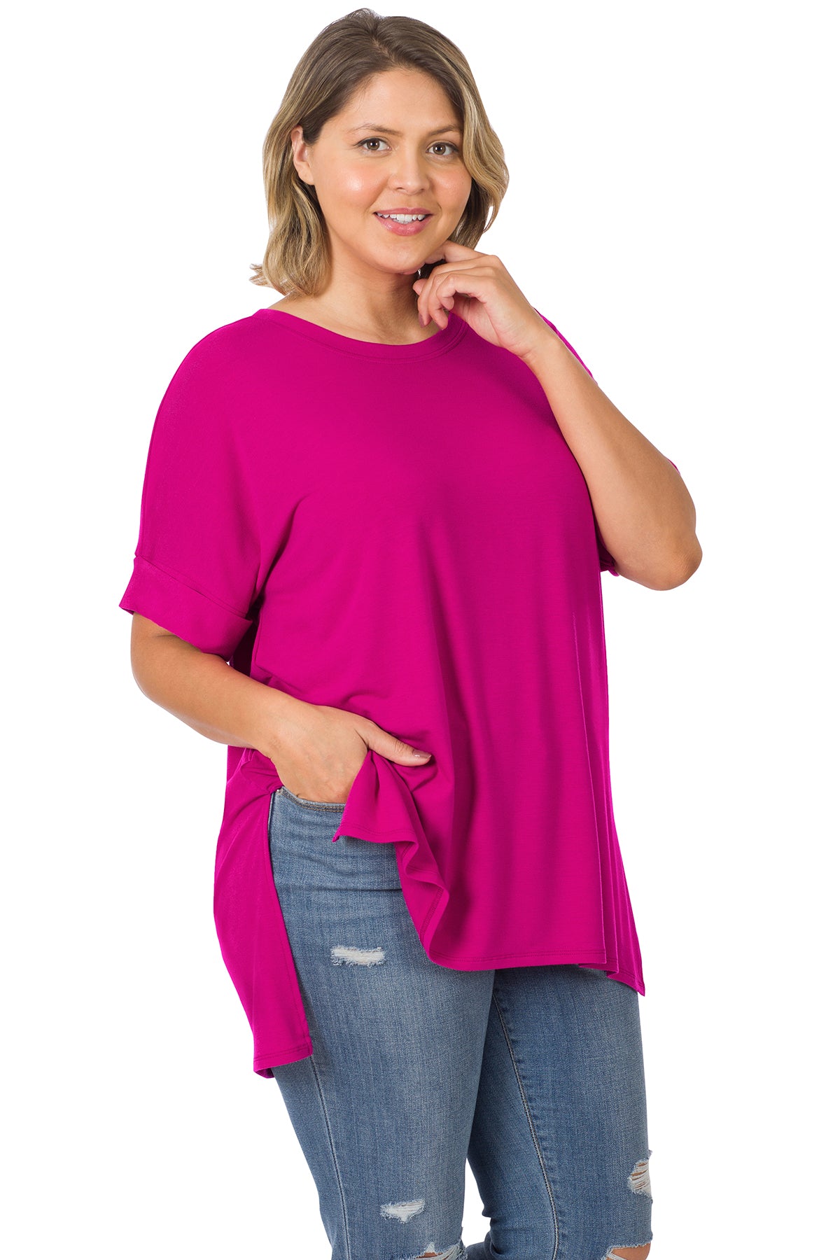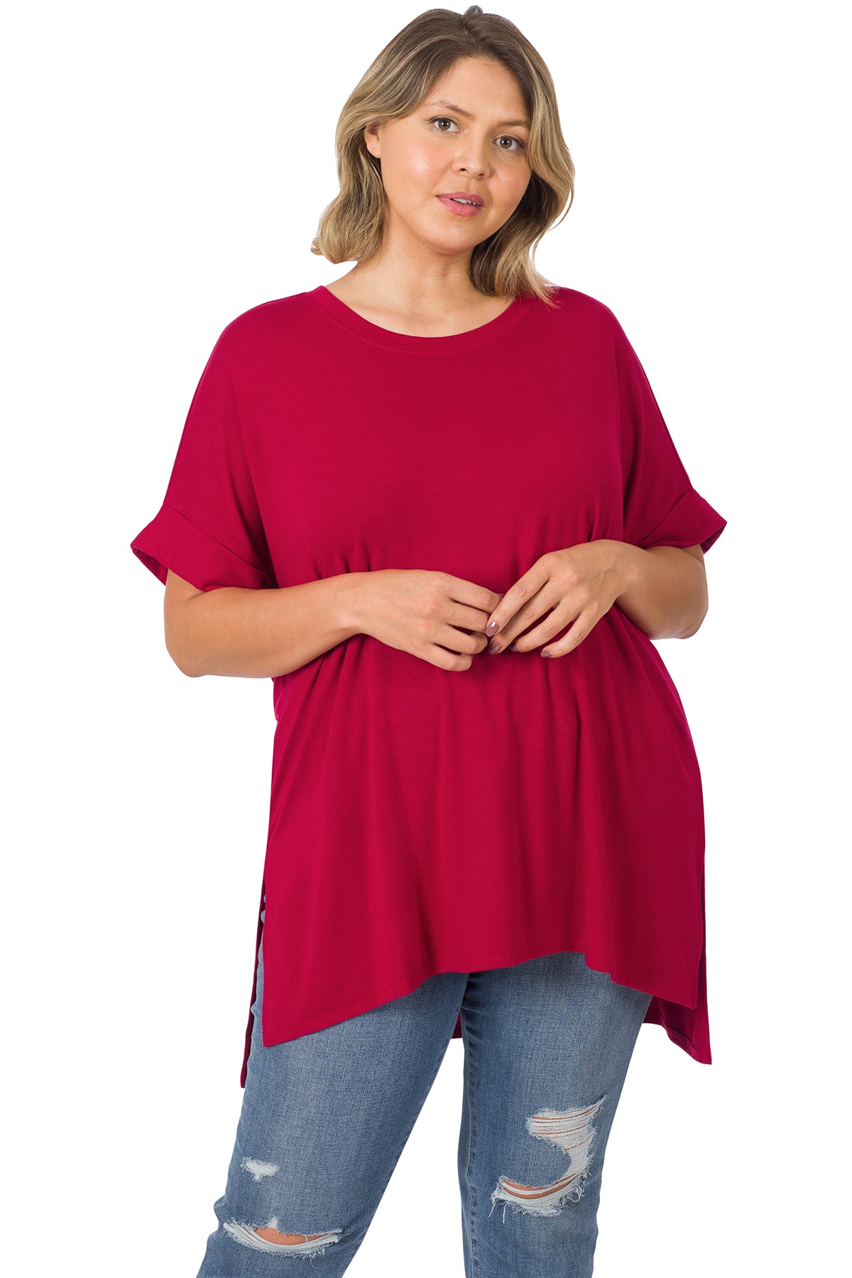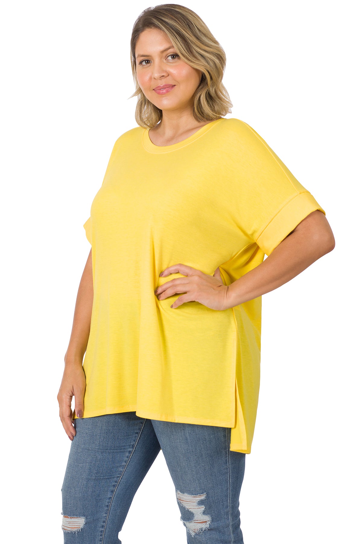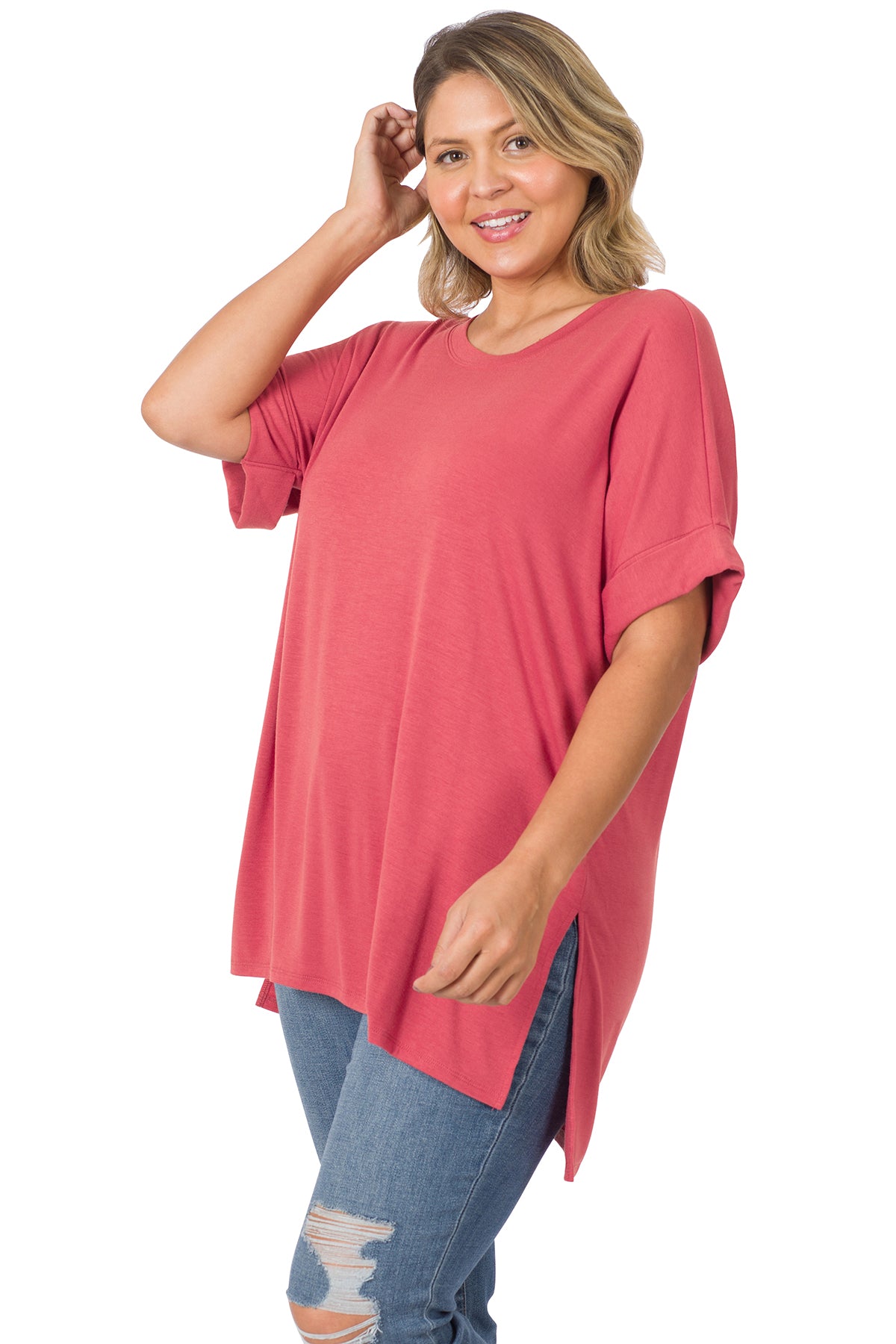 ROLLED SHORT SLEEVE ROUND NECK TOP WITH SIDE SLIT HIGH-LOW HEM