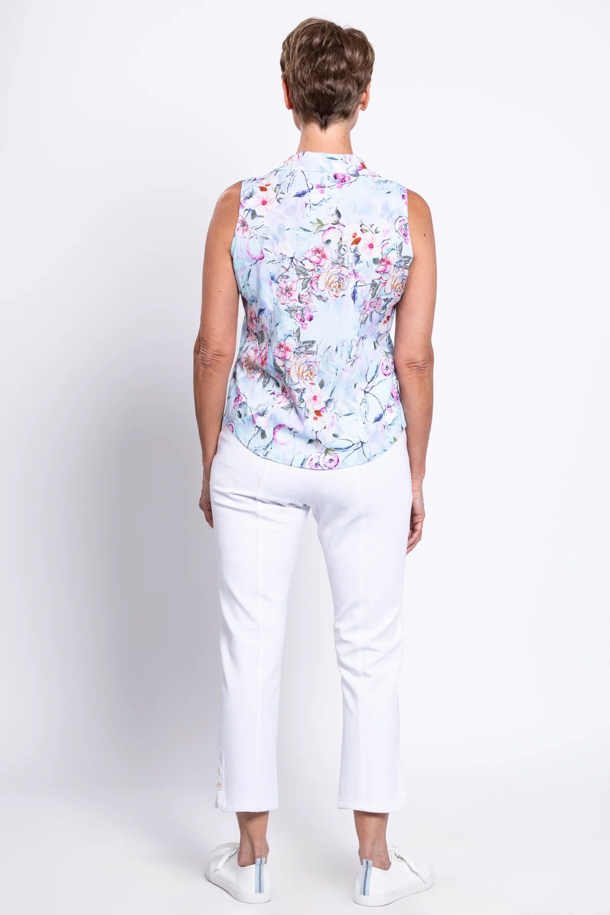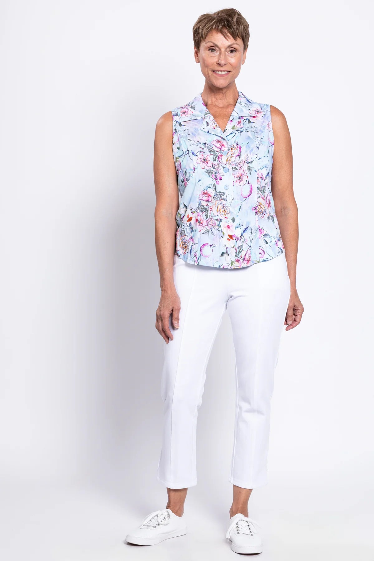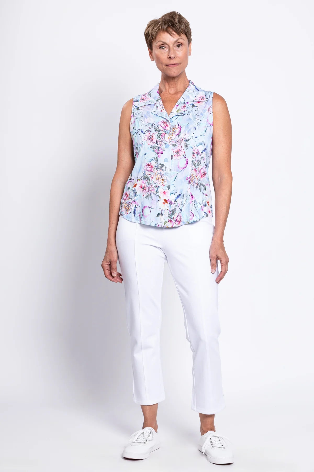 Soft, breathable Linen/Bamboo fabric in a tailored sleeveless shirt style. The Lexa is great paired with capri pants or layered under a cardigan on cooler days.