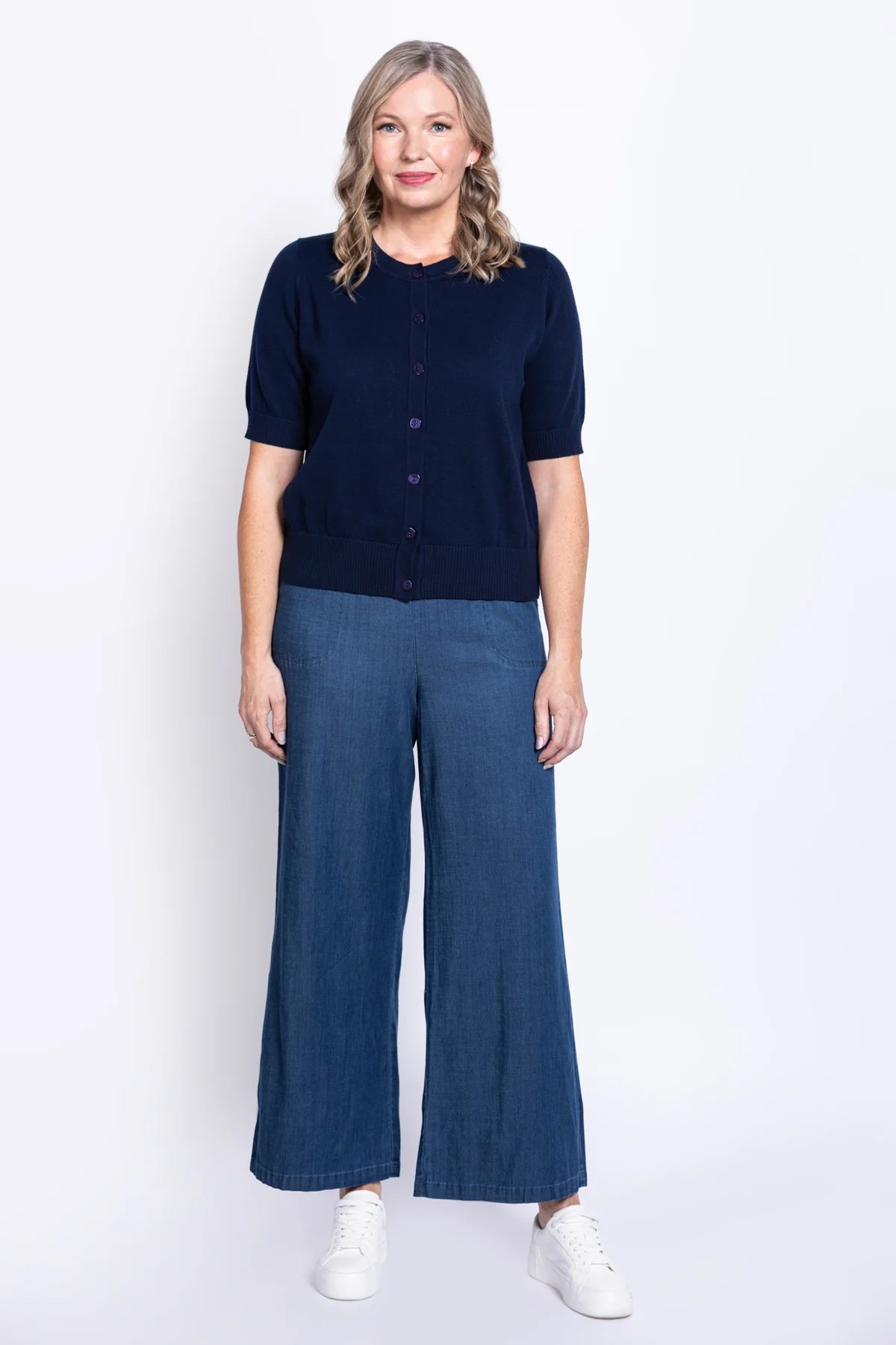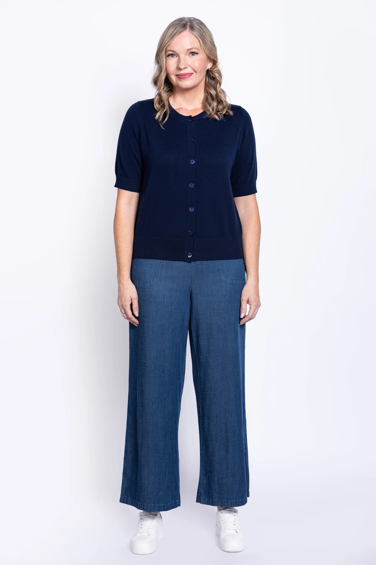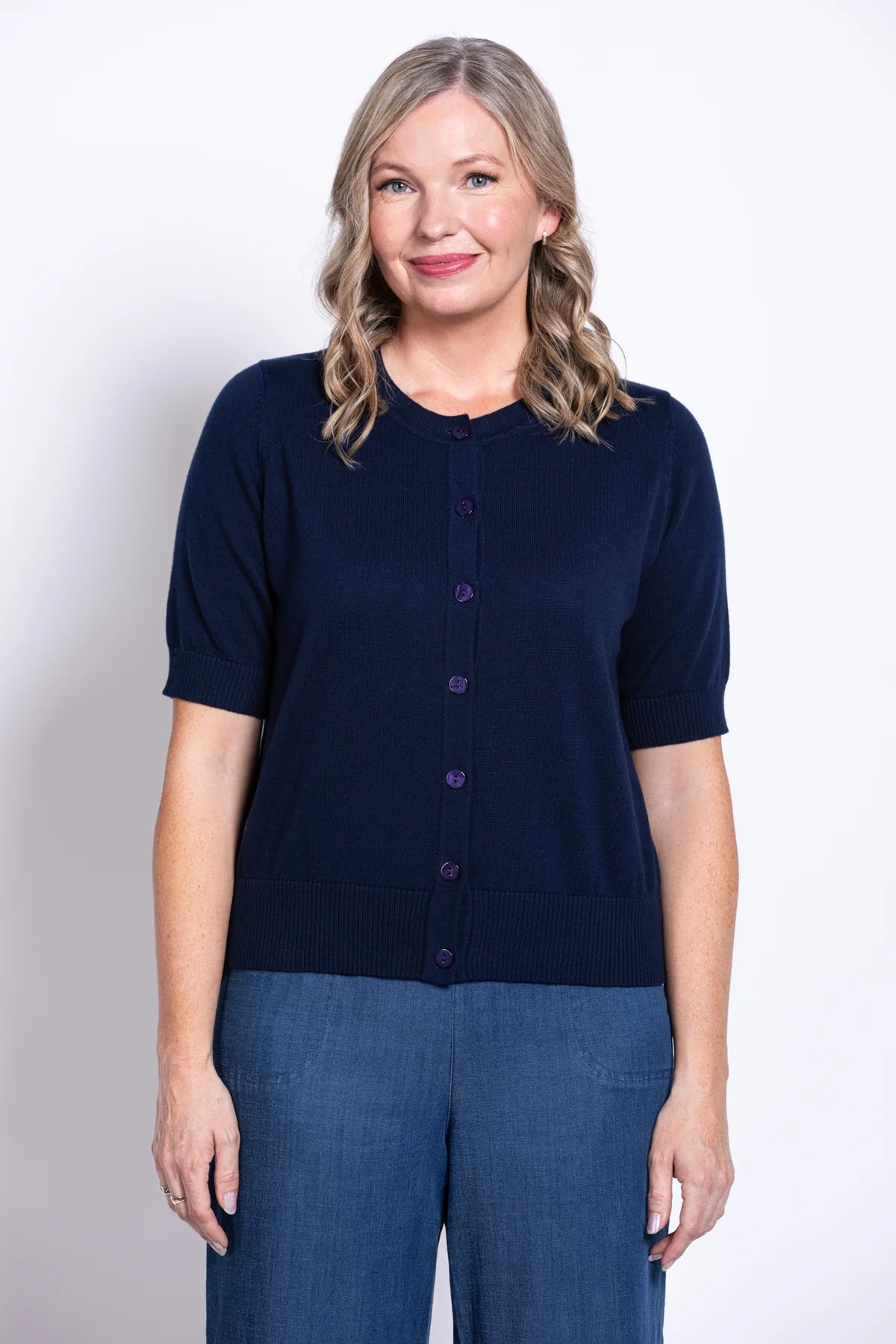 Our Shen Cardigan features a round ribbed neckline, short sleeves with ribbed cuffs, and a ribbed hemline. It sits right at the hips and is made from soft, breathable cotton to keep you comfortable all day long.