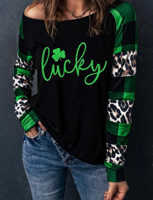 Lucky Clover Glitter Pattern Leopard & Plaid Top