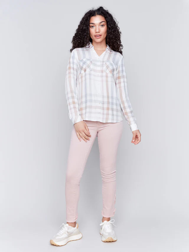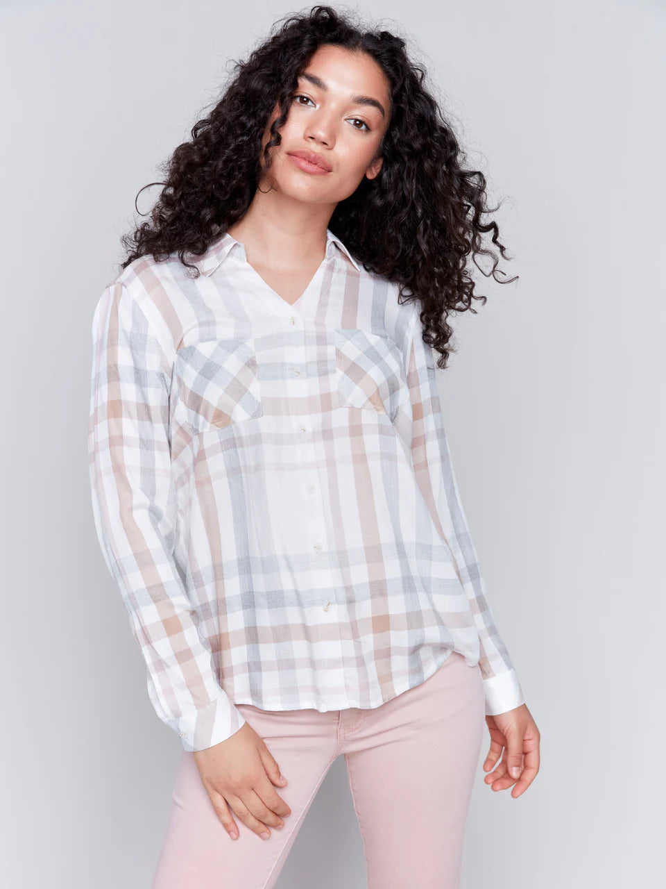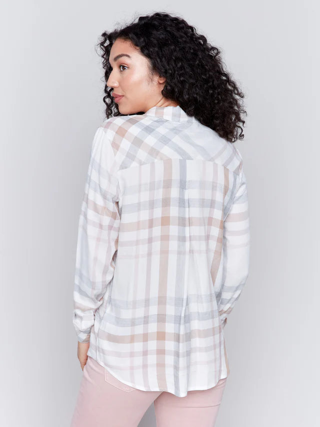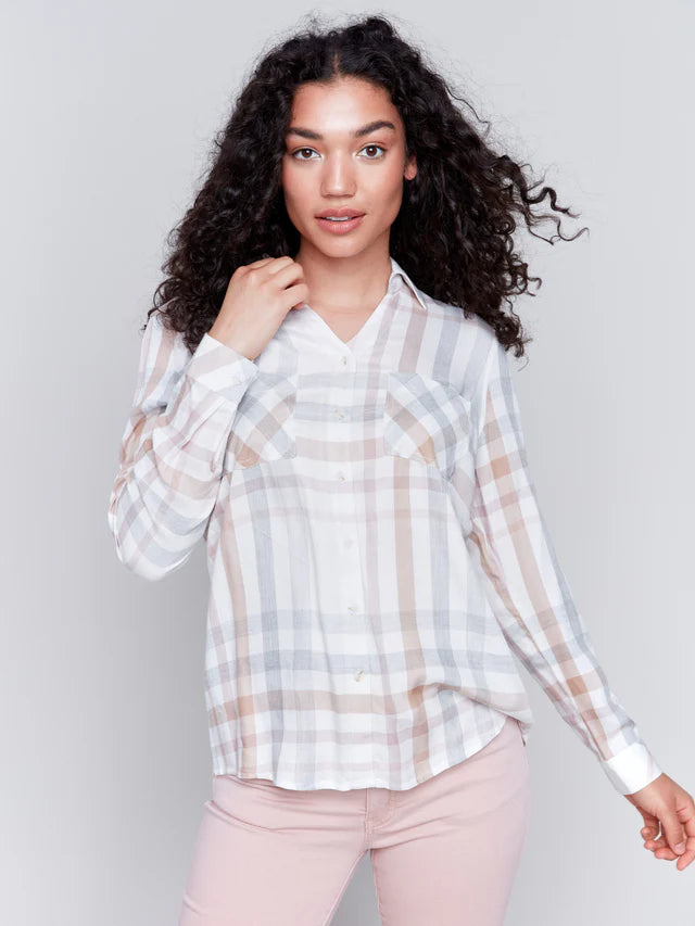 Elevate your casual style with our Soft Plaid Button-Down Shirt, expertly designed to blend fashion with functionality. Featuring practical front chest pockets and a timeless mix of pink, grey, and white tones, this shirt adds a classic touch to your fall wardrobe. Enjoy the perfect balance of comfort and modern style. Make this versatile piece your go-to for effortless daily chic.