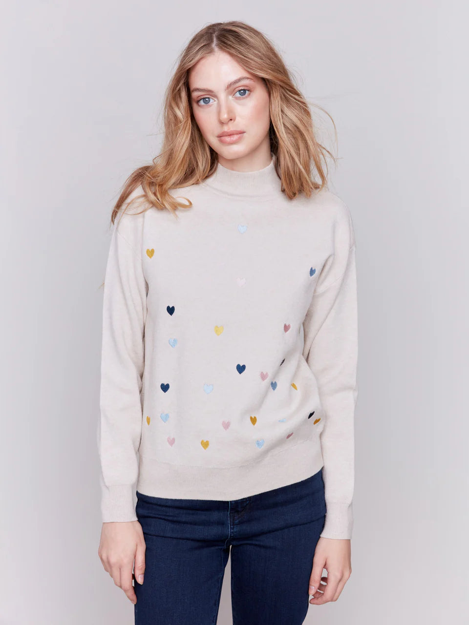Embrace style and comfort with this mock neck sweater! It showcases heart embroidery in vibrant colors that adds a playful touch to your look. Its casual elegance makes it perfect for any occasion.