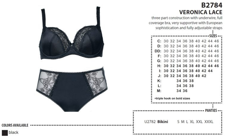 Three part construction with underwire, full coverage bra, very supportive with European sophistication and fully adjustable strap.