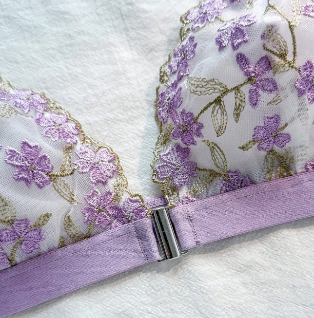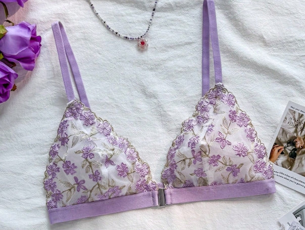 Introducing the French Embroidered Mesh Wireless Bra — the perfect wire free bra French embroidered front closure designed to combine elegance with all-day comfort. This beautifully crafted bra addresses common pain points while enhancing your lingerie collection with subtle purple floral accents on a white fabric background.